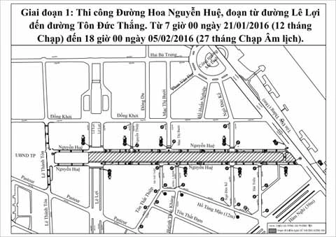 Từ ngày 21-1 đến 5-2-2016 (tức từ 12 đến 27 tháng Chạp) đội thi công đường hoa sẽ chiếm dụng toàn bộ phố đi bộ Nguyễn Huệ và một phần làn đường lưu thông hai bên đường Nguyễn Huệ để thi công. Xe cộ vẫn được phép lưu thông trên đường Nguyễn Huệ trong thời gian này.