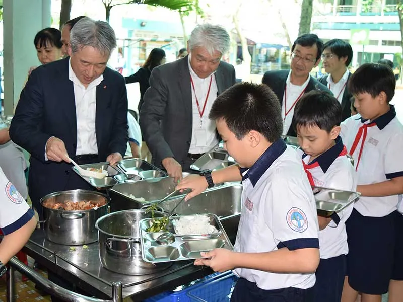 Chủ tịch kiêm Giám đốc điều hành Tập đoàn Ajinomoto(ngoài cùng bên trái) thăm Trường Tiểu học Trưng Trắc và bếp ăn chuẩn thuộc dự án Bữa ăn học đường. Ảnh: CTV