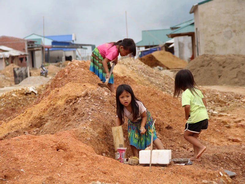 Những đứa trẻ nghịch đất giữa vùng tái định cư bản Chim còn đó bao ngổn ngang. Ảnh: ĐẶNG TRUNG