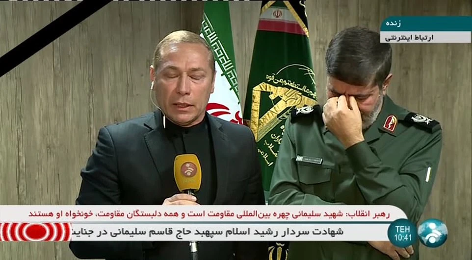 Trong một cuộc phỏng vấn, phóng viên và người phát ngôn của IRGC Ramezan Sharif đều ôm chầm nhau khóc khi nhắc đến ông Soleimani. Ảnh: Al-jazeera