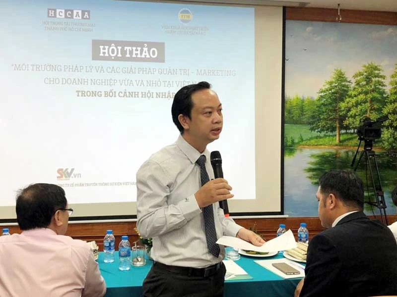 Ông Trần Giang Khuê (Phó Trưởng đại diện Văn phòng Cục Sở hữu trí tuệ tại TP.HCM) giải đáp thắc mắc cho doanh nghiệp vừa và nhỏ tại hội thảo. Ảnh: KP