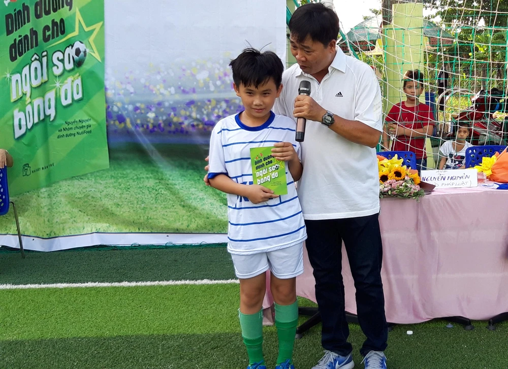 Nhà báo Nguyễn Nguyên mở cuốn sách “Dinh dưỡng cho ngôi sao bóng đá” chỉ hình ảnh các học viên học viện NutiFood JMG cho các em xem và cho biết: “Khi mới vào học viện NutiFood, các anh cũng nhỏ xíu như các con nhưng nhờ ăn đúng và đầy đủ dinh dưỡng nên giờ các anh ấy ai cũng cao lớn đến nỗi chú Phan Thanh Bình cũng phải “ganh tị”.