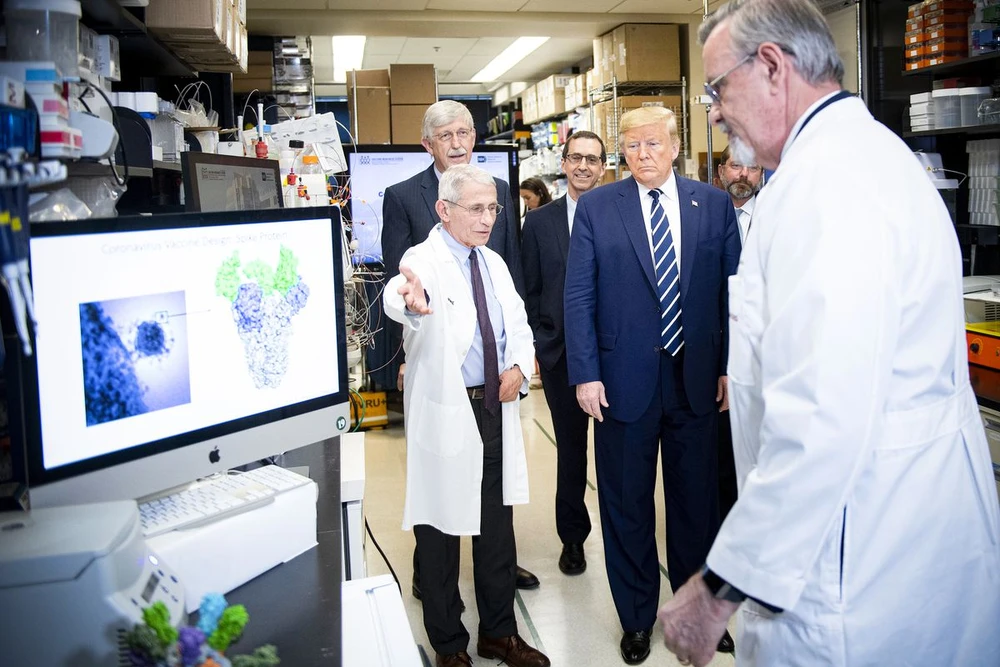 Tổng thống Donald Trump (giữa) cùng một số quan chức Mỹ đến thăm Viện nghiên cứu vaccine và sức khỏe quốc gia tại bang Maryland hôm 3-3. Ảnh: REUTERS