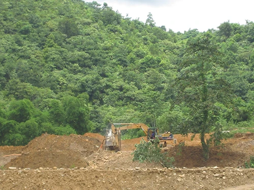 “Vàng tặc” ngang nhiên mang máy đào vào đào phá đất rừng thuộc địa bàn xã Cắm Muộn (huyện Quế Phong, Nghệ An) để lấy vàng - Ảnh phóng viên Đình Tiệp chụp lúc 11g56 ngày 6-8-2014.