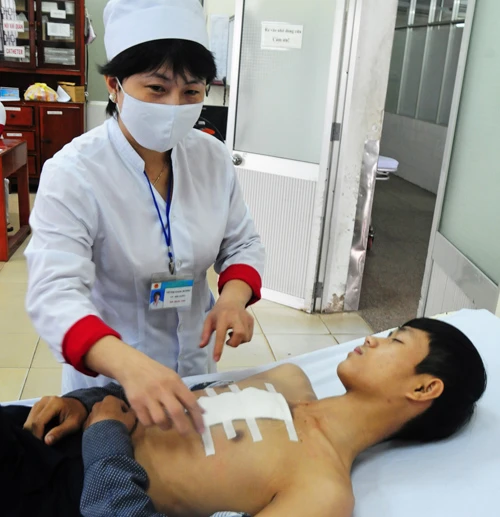 Vương Đình Tâm trúng pháo hoa bị bỏng nặng vùng ngực, bụng đang được y, bác sĩ điều trị. Ảnh: Trung Thu