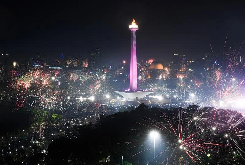 Pháp hoa ngập tràn quanh Đài tưởng niệm Quốc gia, ở Jakarta, Indonesia. Ảnh: REUTERS