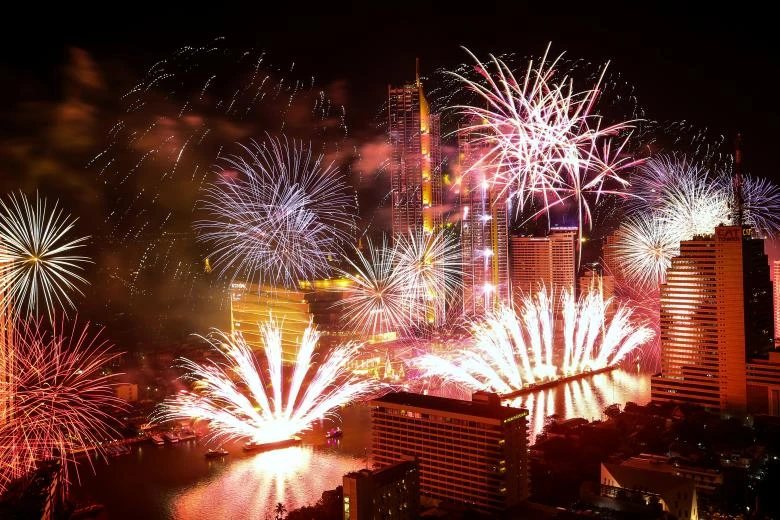 Pháo hoa được bắn trên sông Chao Phraya, trong lễ đón năm mới ở Bangkok, Thái Lan. Ảnh: REUTERS