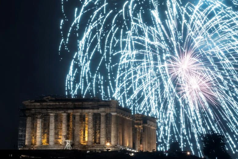 Pháo hoa được bắn cạnh ngôi đền Parthenon cổ xưa ở Athens, Hy Lạp. Ảnh: REUTERS