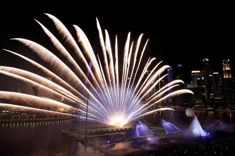 Buổi lễ hội pháo hoa tại Singapore bắt đầu sớm hơn những nước nằm trong cùng múi giờ. Buổi trình diễn này kéo dài đến gần một tiếng đồng hồ, theo Straits Times. Hoạt động bắn pháo hoa sớm trên vịnh Marina thật ra là một phần của chương trình đại nhạc hội và ánh sáng The Float.
