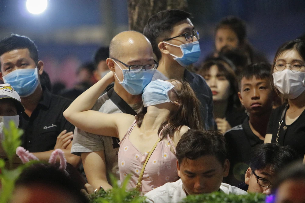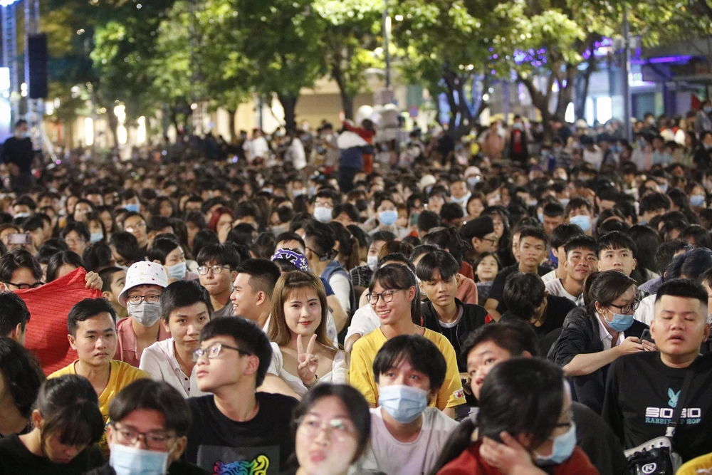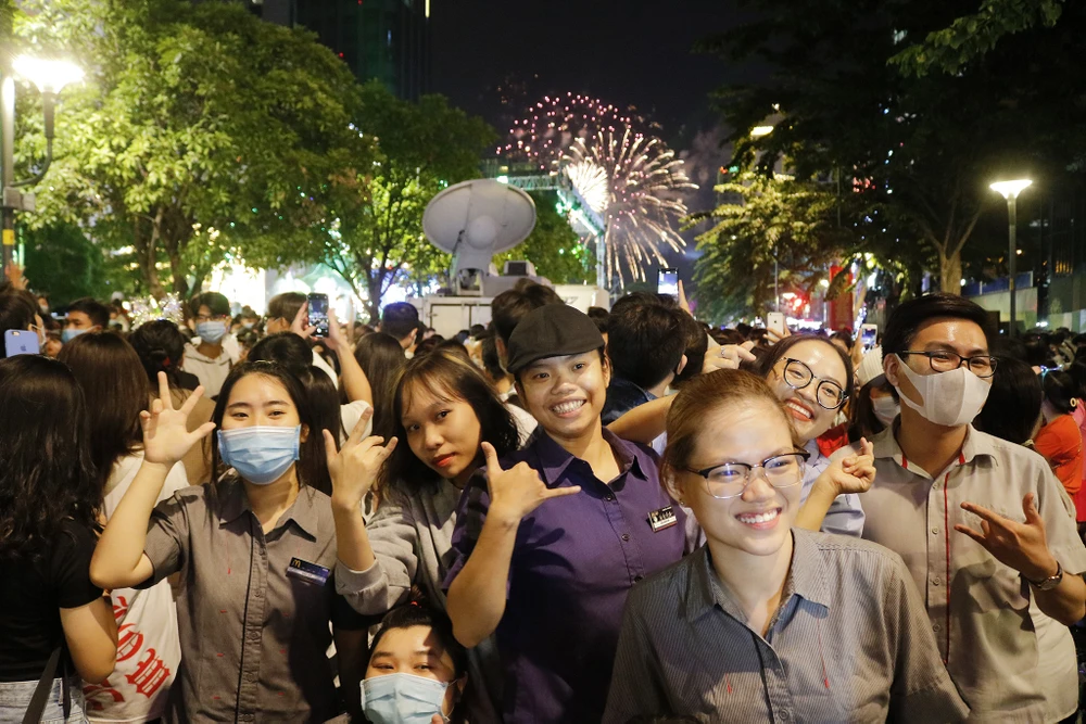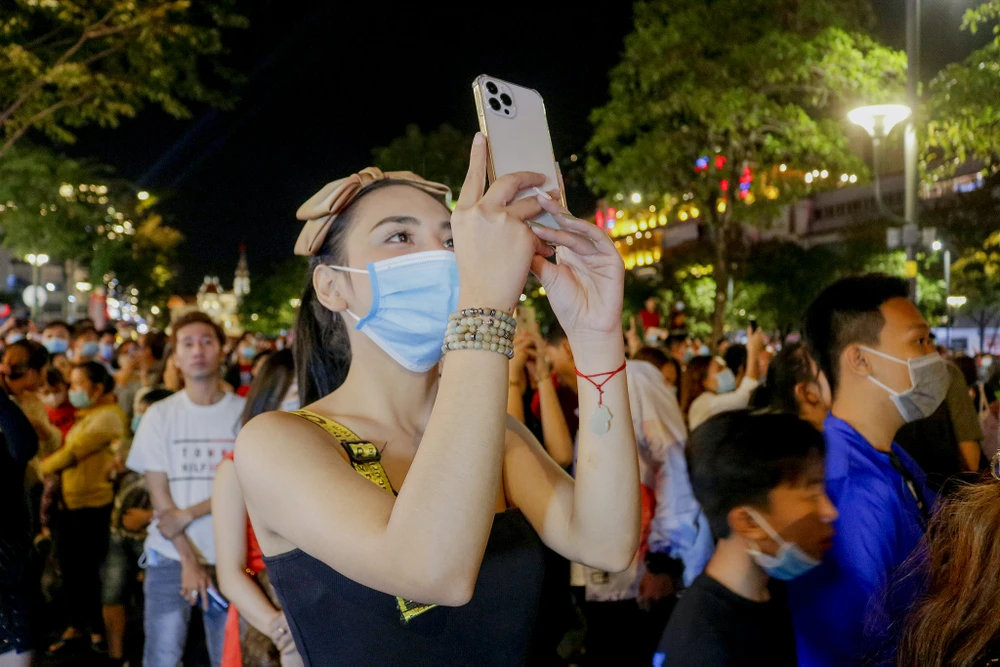 Hàng chục ngàn người dân có mặt tại phố đi bộ Nguyễn Huệ thưởng thức chương trình nghệ thuật và chào đón năm mới 2021.