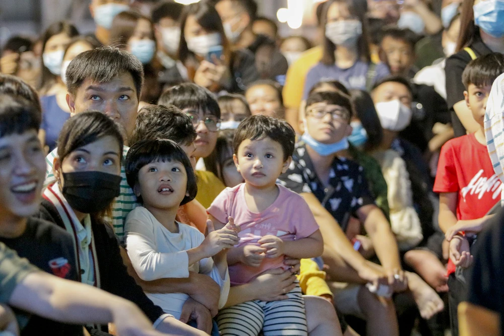 Trẻ con đi cùng với gia đình chờ xem pháo hoa.