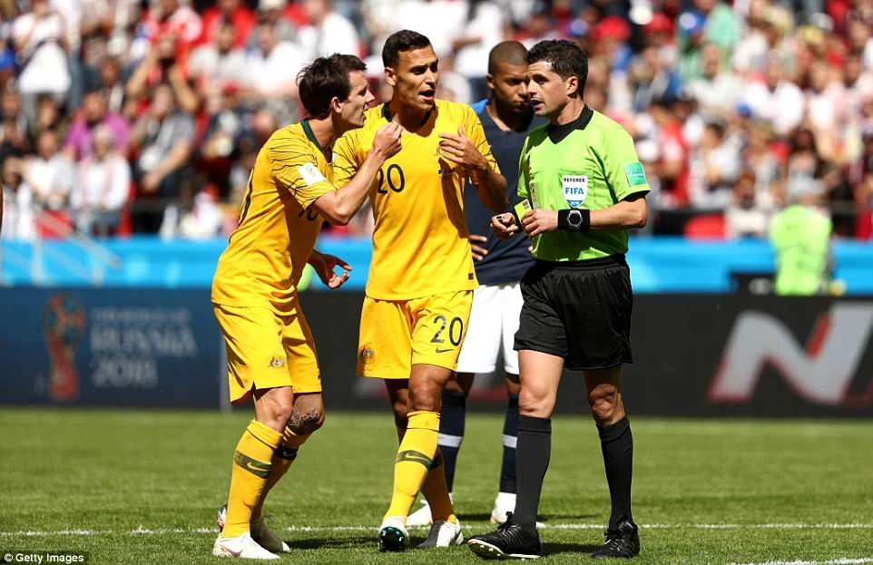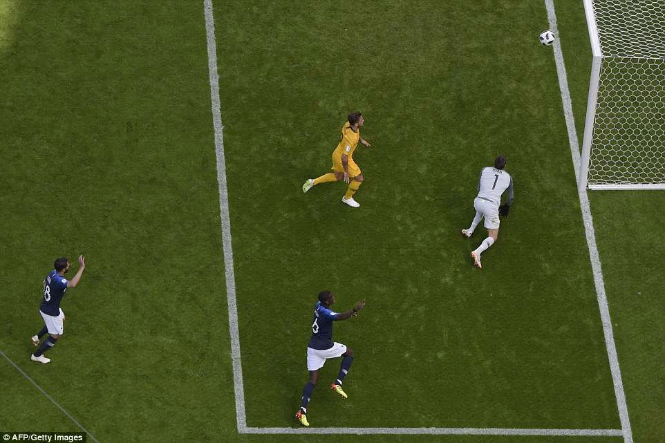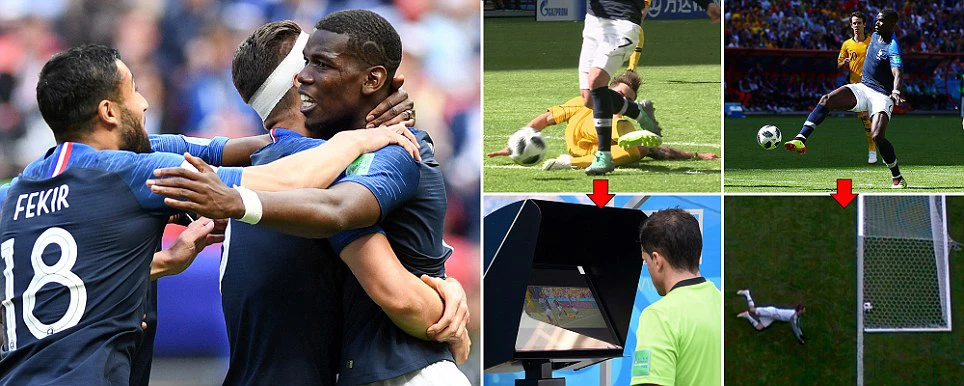 Sau đó vị trọng tài này quay vào sân và chỉ thẳng tay về chấm đá phạt 11 m, đồng thời rút thẻ vàng phạt Risdon. Điều này cho thấy trọng tài đã nhờ công nghệ VAR để thay đổi quyết định của mình. Trên chấm 11 m, Griezmann sút bóng đánh lừa thủ thành Mathew Ryan mở tỉ số 1-0 cho Pháp.