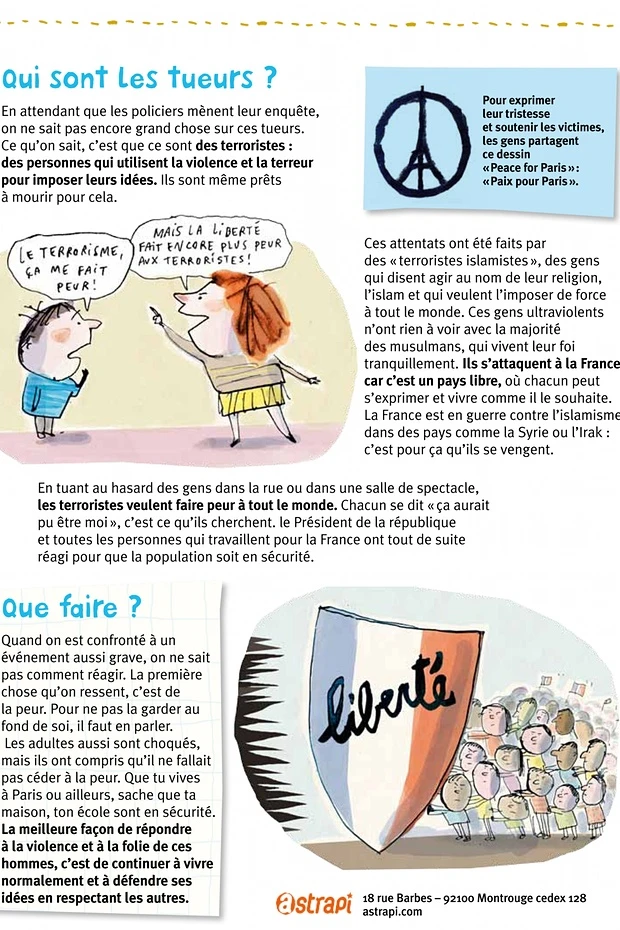 Tờ rơi cũng đặt ra một số câu hỏi vừa cho học sinh vừa cho phụ huynh: Tại sao chúng giết những người vô tội? Những kẻ khủng bố là ai? Chúng ta có thể làm gì?