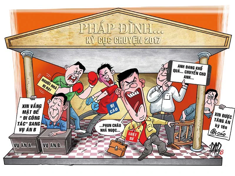 Năm 2017 còn rất nhiều chuyện kỳ cục chốn pháp đình, như nhóm bị cáo giết người vẫn cười tươi tại phiên xử chiều 6-12-2017 ở TAND TP.HCM; tòa định đưa bị cáo nguyên là phó chánh án TAND huyện Ea Kar vào trại giam để xét xử cho ấm cúng; đương sự lột guốc rượt thẩm phán; bị cáo hát giữa tòa… Mong là năm nay, văn hóa pháp đình lộn trọc các kiểu bớt bớt lại, bởi chẳng ai muốn bật cười mà đau như bị “hoạn” thế này!