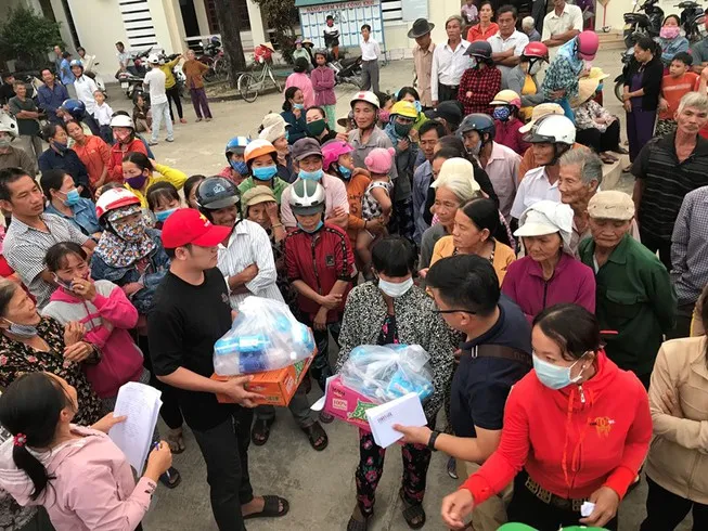 Trường Giang và nhiều nghệ sĩ cùng đại diện báo Pháp Luật TP.HCM trao quà cứu trợ cho người dân tại Quảng Bình.