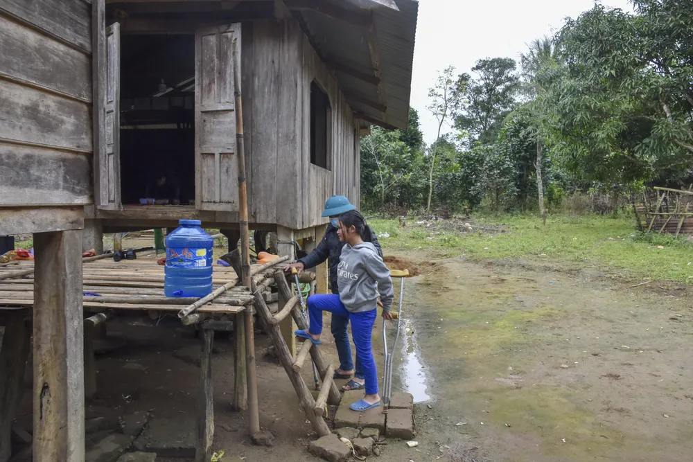 Gia đình ông Alăng Crơ có bốn người, sống trong ngôi nhà gỗ ọp ẹp dựng từ năm 2007 cũng vừa được báo trao 100 triệu hỗ trợ xây nhà. Ảnh: T.AN