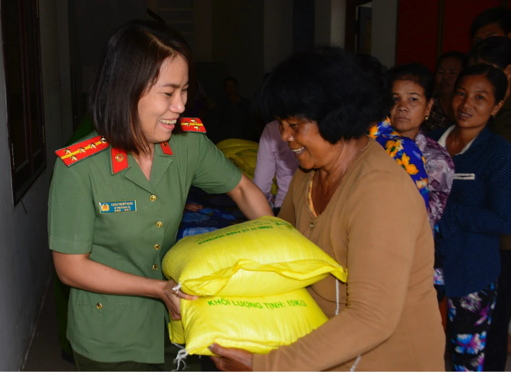 Chiều 11-9, thừa ủy quyền của Ban Giám đốc Công an tỉnh Trà Vinh, Hội Phụ nữ công an tỉnh tổ chức thăm hỏi và trao 100 phần quà (mỗi phần 20 kg gạo) cho bà con nghèo, người đồng bào Khmer thuộc phường 8 và phường 9, TP Trà Vinh, tỉnh Trà Vinh.
