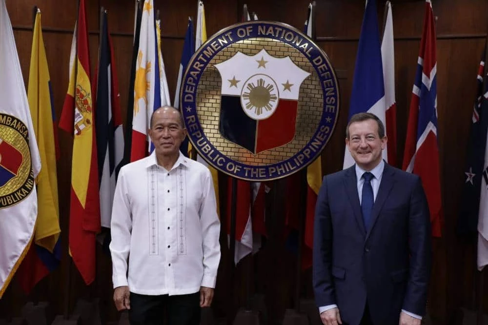 Ông Bertrand Lortholary (phải) và Bộ trưởng Quốc phòng Philippines Delfin Lorenzana. Ảnh: DND
