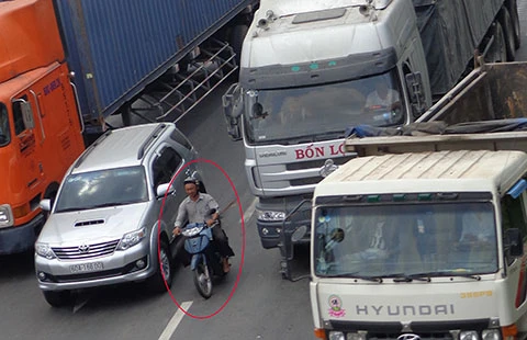 Dòng xe từ TP.HCM đi Biên Hòa thường ùn ứ trên đường bên hông cầu vượt Tân Vạn. Người đi xe máy phải len lỏi, vượt lên trước đầu các xe tải cực kỳ nguy hiểm. Ảnh: L.ĐỨC