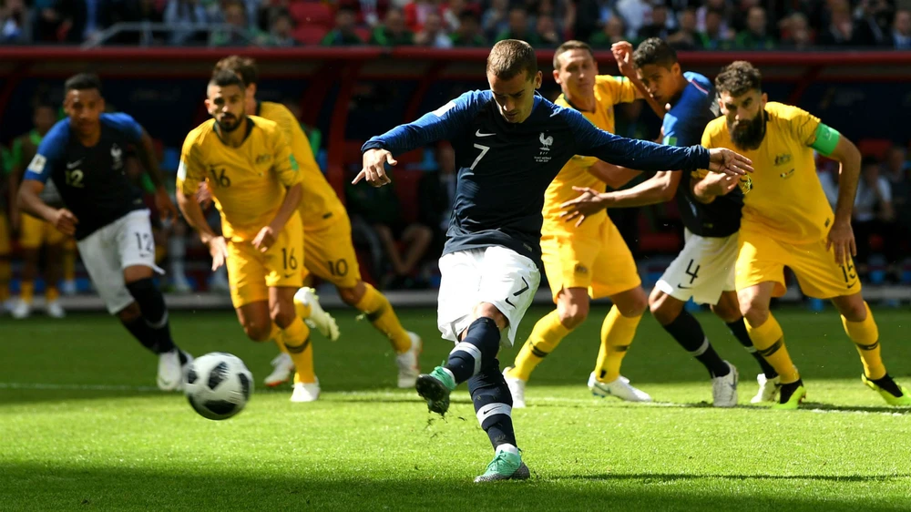 Giữa hai bàn thắng của Pháp là pha chơi bóng chuyền trong vòng cấm của Umtiti buộc trọng tài thổi phạt đền cho Úc. Và Jedinak đã không bỏ qua món quà quý giá ghi bàn trên chấm 11 m cho đội nhà.