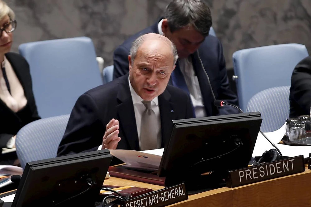 Ngoại trưởng Pháp Laurent Fabius phát biểu tại Hội đồng Bảo an khi Pháp làm chủ tịch vào tháng 3-2015. Ảnh: REUTERS