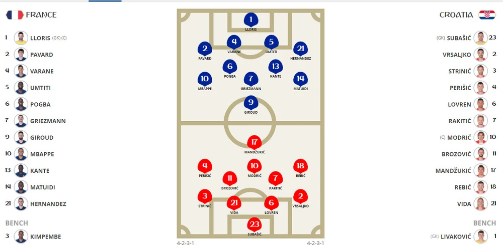 Cả hai đội đều mặc trang phục truyền thống trong trận chung kết World Cup 2018. Croatia ra sân với trang phục áo trắng đỏ quần trắng tất trắng, Pháp xuất phát với chiếc áo xanh, quần xanh, tất xanh.