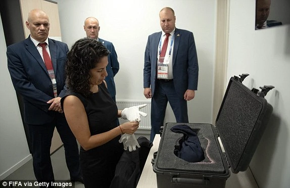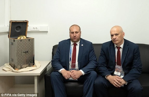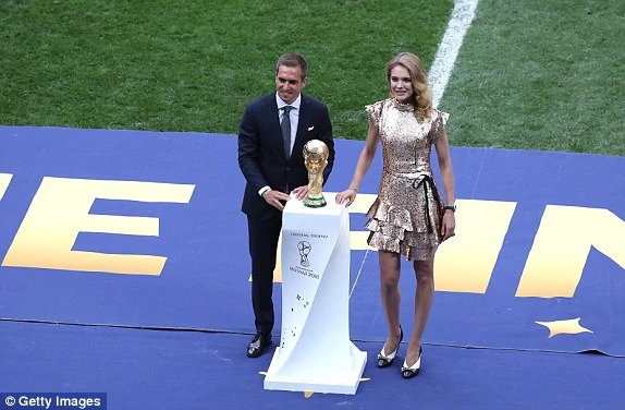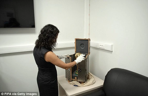 Chiếc cúp vô địch World Cup được đem ra sân.