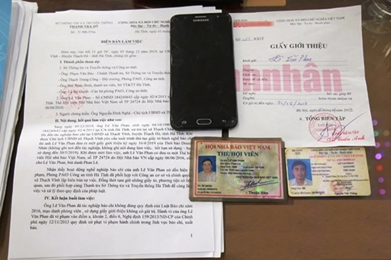 Phan bị tịch thu phương tiện vi phạm gồm một giấy giới thiệu ký ngày 16-4-2019 của Thời báo DN (không ghi nơi đến tác nghiệp, không có nội dung làm việc, hạn sử dụng đến ngày 30-5-2019), một thẻ hội viên Hội Nhà báo Việt Nam cấp ngày 6-6-2016 (loại thẻ cũ) với bút danh Phan Lê.