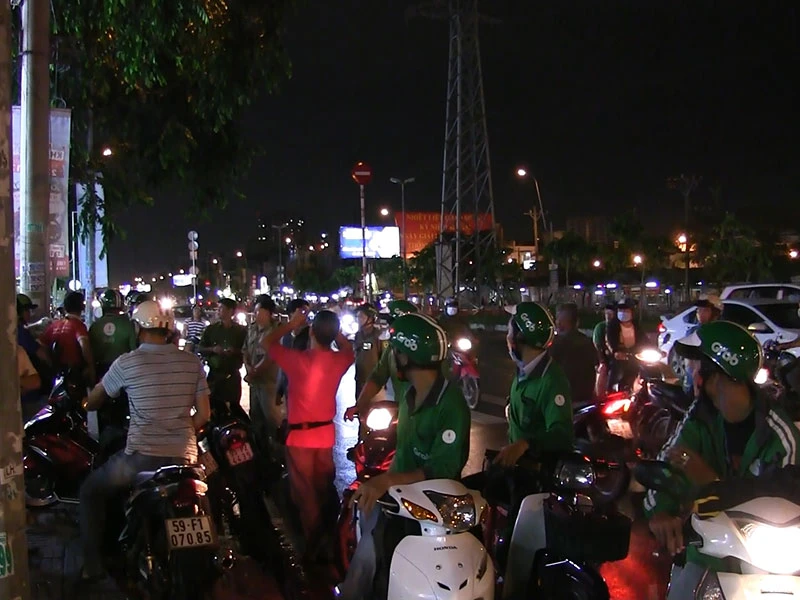 Công an sau đó mời làm việc với cả xe ôm truyền thống và GrabBike. Ảnh: H.Tâm