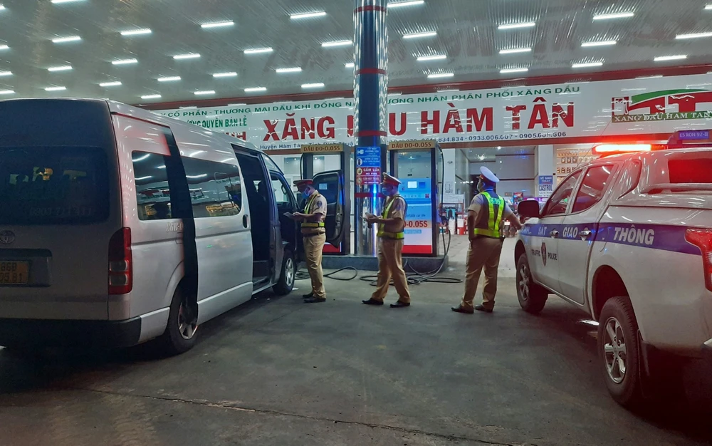 CSGT Bình Thuận kiểm tra chiếc xe lén lút chở khách từ Bình Thuận vào TP.HCM rạng sáng 7-6.