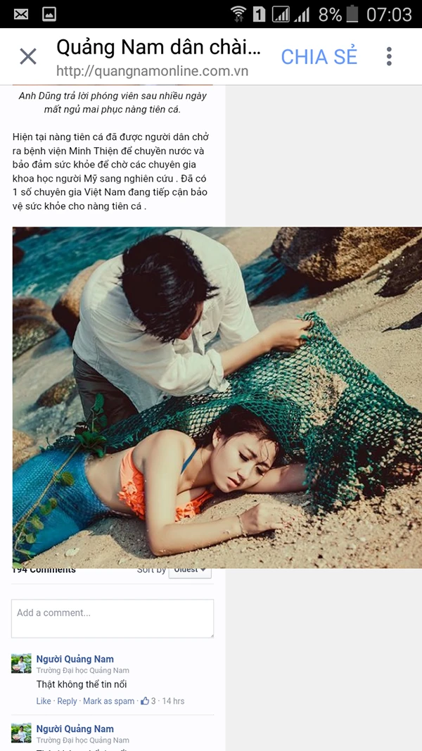 Trước đó, như Pháp Luật TP.HCM đã thông tin, vào tháng trước, cư dân các mạng xã hội chia sẻ rầm rộ thông tin đăng trên trang quangnamonline.com.vn về việc một người dân ở xóm Lưới (xã Tam Anh Nam, huyện Núi Thành, Quảng Nam) đã mai phục nhiều ngày và dùng thuốc mê bắt được một “nàng tiên cá” nặng 48 kg. Trang này còn thông tin hiện “nàng tiên cá” đang được điều trị tại BV Minh Thiện (TP Tam Kỳ). Tuy nhiên khi PV liên hệ với một số lãnh đạo bệnh viện này thì được xác nhận là không hề có sự việc như trên.