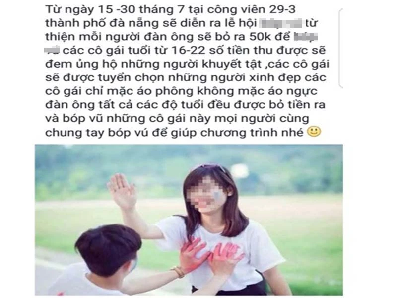 Trước đó, trên mạng xã hội lan truyền thông tin từ ngày 15 đến 30-7, tại Công viên 29-3 (TP Đà Nẵng) sẽ diễn ra lễ hội sờ ngực để quyên tiền làm từ thiện. Theo đó, mỗi người đàn ông sẽ bỏ ra 50 ngàn để sờ ngực các cô gái từ 16- 22 tuổi. Số tiền thu được sẽ đem ủng hộ cho những người khuyết tật.