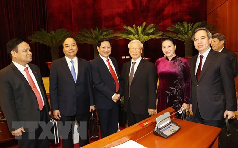 Tổng Bí thư, Chủ tịch nước Nguyễn Phú Trọng và các lãnh đạo dự bế mạc Hội nghị. Ảnh: TTXVN