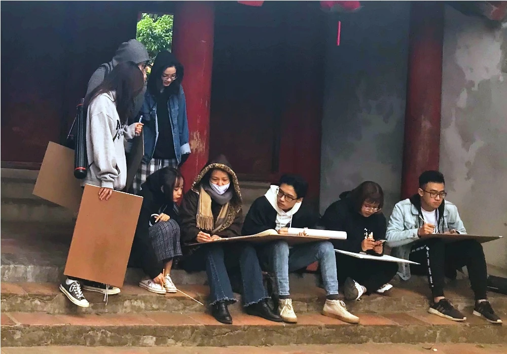 Các sinh viên vẽ ký họa tại Văn Miếu- Quốc Tử Giám. Ảnh V.THỊNH