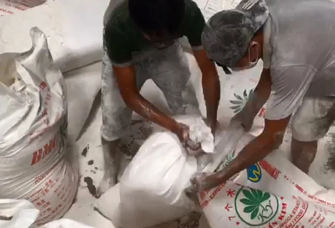 Cụ thể, các công nhân này thực hiện cắt miệng các bao hàng tinh bột sắn nhãn hiệu BMC (Made in Lao) loại 50kg/ bao rồi đổ trực tiếp sang vỏ bao bì mới mang nhãn hiệu Kim Yến của Công ty TNHH sản xuất thương mại xuất nhập khẩu Kim Yến (trụ sở tại huyện Tân Châu, Tây Ninh). Sau đó, sử dụng máy để khâu miệng bao hàng lại.