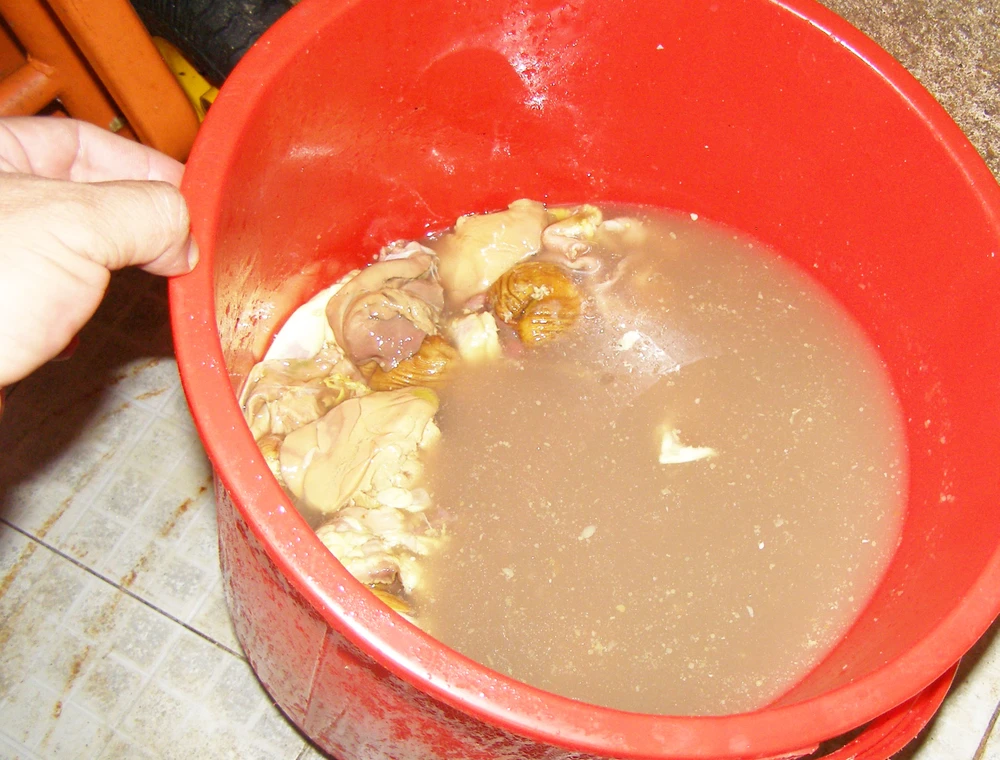 Phụ phẩm heo, gà ngâm trong nước đục ngầu, gớm ghiết. Ảnh: TRẦN NGỌC