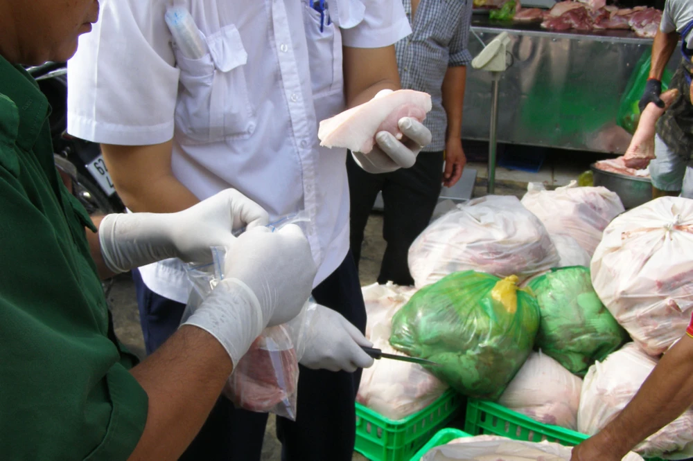Cơ quan thú y TP.HCM lấy mẫu thịt heo xét nghiệm. Ảnh: TRẦN NGỌC
