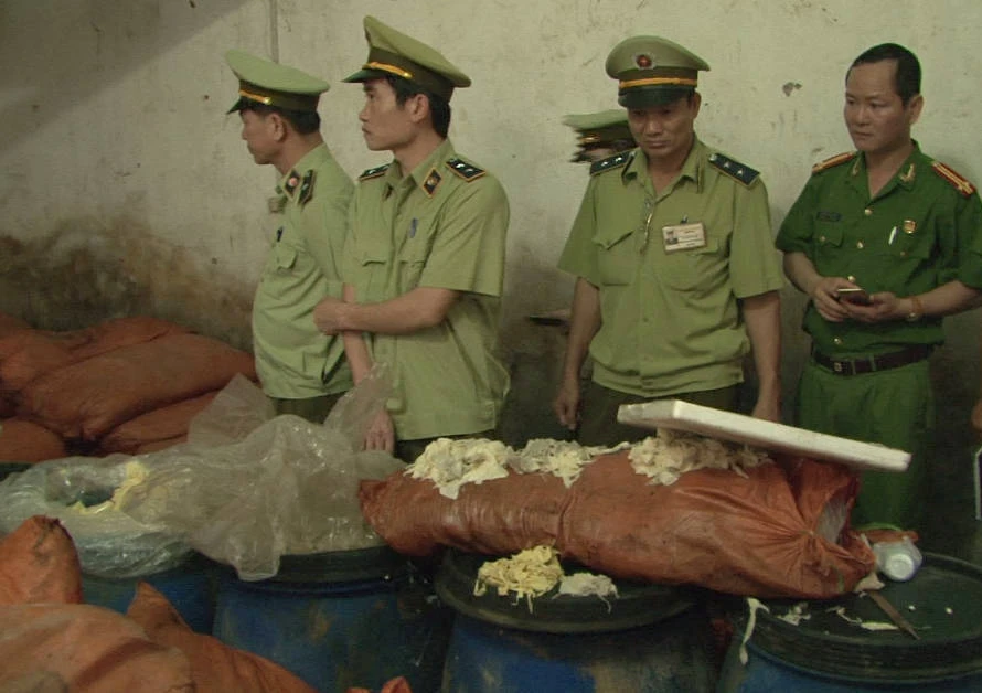 Lực lượng công an và quản lý thị trường kiểm tra phát hiện kho chứa măng của ông Dương Văn Lợi, đang bốc mùi hôi thối.