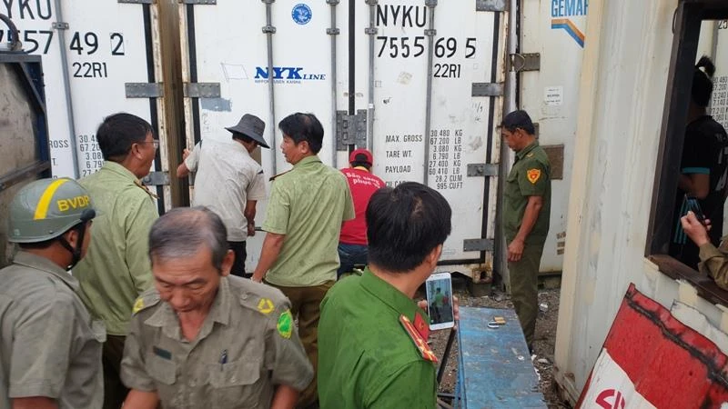 Lực lượng chức năng tỉnh Bình Dương đang kiểm tra container chứa thịt heo thối