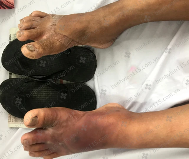 Trước đó, bà HTS (53 tuổi, ở tỉnh Trà Vinh) vào BV Nhân dân 115 trong tình trạng bàn chân trái sưng đỏ, kẽ ngón 1 và 2 bàn chân chảy dịch, sốt lạnh run. Bà S. cho biết đang phụ rửa chén, dĩa cho một quán cơm, không có tiền sử đái tháo đường trước đó.