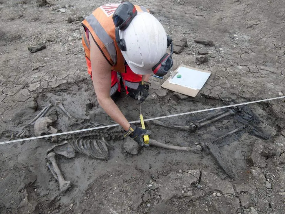 Một nhà khảo cổ đang nghiên cứu bộ xương. Ảnh: MOLA
