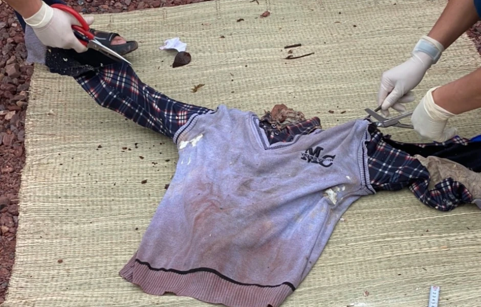Tại hiện trường có một số đồ vật có đặc điểm như chiếc áo phao bên ngoài màu xanh, bên trong màu đen, có các dây thắt an toàn màu đen. Trên áo phao có dòng chữ “JAOMEL * FINEAY”.