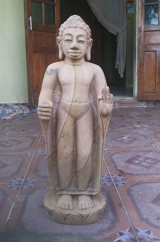 Bức tượng Phật bằng đá được gia đình ông Tứ phát hiện trong lúc làm vườn nhà. Ảnh: N.T