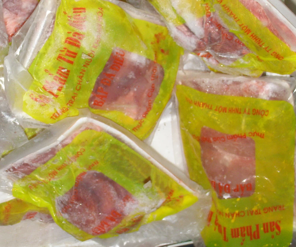 Bao bì thịt đà điểu không ghi tên và địa chỉ cở sở sản xuất. Ảnh: TRẦN NGỌC Nhãn và bao bì thịt nhím đóng gói không có tên và địa chỉ doanh nghiệp sản xuất. Ảnh: TRẦN NGỌC