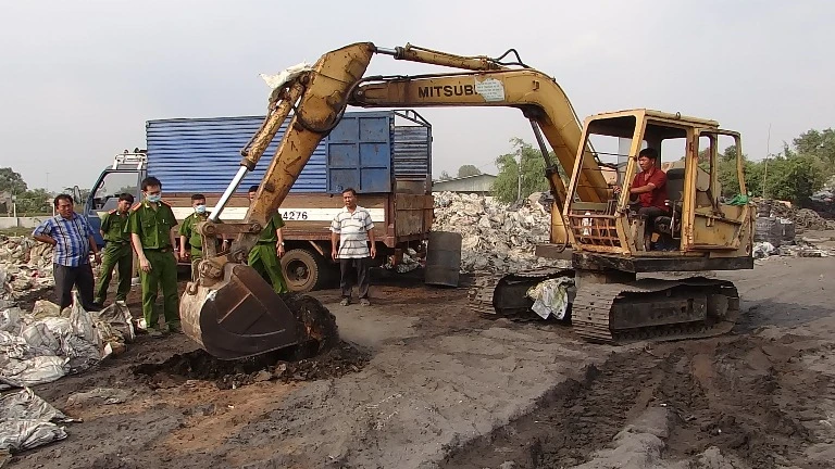Đến chiều 11-3, sau khi dùng xe cuốc đào múc số chất thải được san lấp trái phép, đoàn công tác của Phòng 6 Cục Cảnh sát phòng chống tội phạm về môi trường (C49) xác định doanh nghiệp tư nhân Phi Trường (huyện Trảng Bảng, Tây Ninh) đã dùng bụi than để san lấp mặt bằng trên diện tích khoảng 1.000 m2.