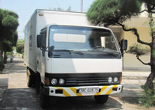 Chiếc xe tải chở phân bón sản xuất trái phép bị công an tạm giữ.