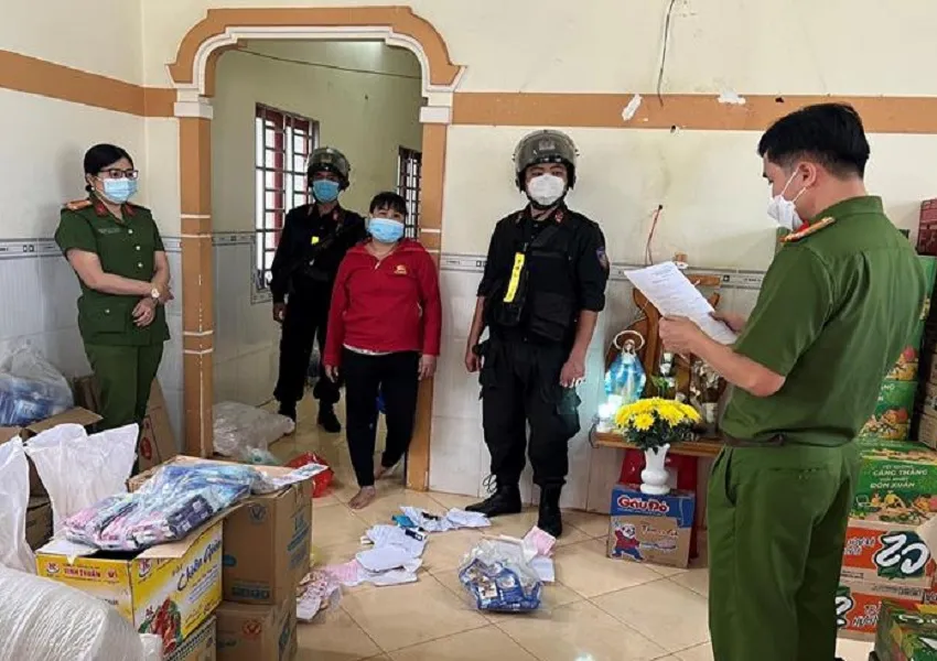 Công an thi hành lệnh kiểm tra và khám xét nơi ở cũng là nơi sản xuất của bà Vũ Thị Hoa. Ảnh: VH.