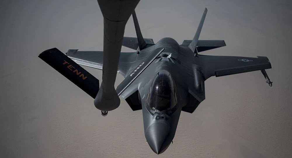 Chiếc F-35A Lightning II của Mỹ trong lúc tiếp dầu trên không. Ảnh: SPUTNIK