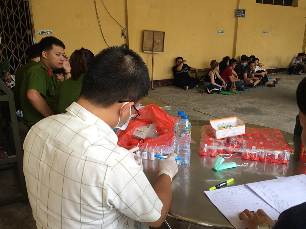 Đến trưa cùng ngày, công an vẫn đang tiến hành kiểm tra ma túy với những người này.