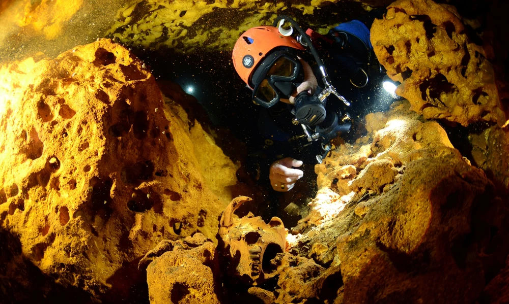 Thợ lặn phát hiện một hộp sọ động vật tại hệ thống hang động Sac Actun. Ảnh: THE GUARDIAN